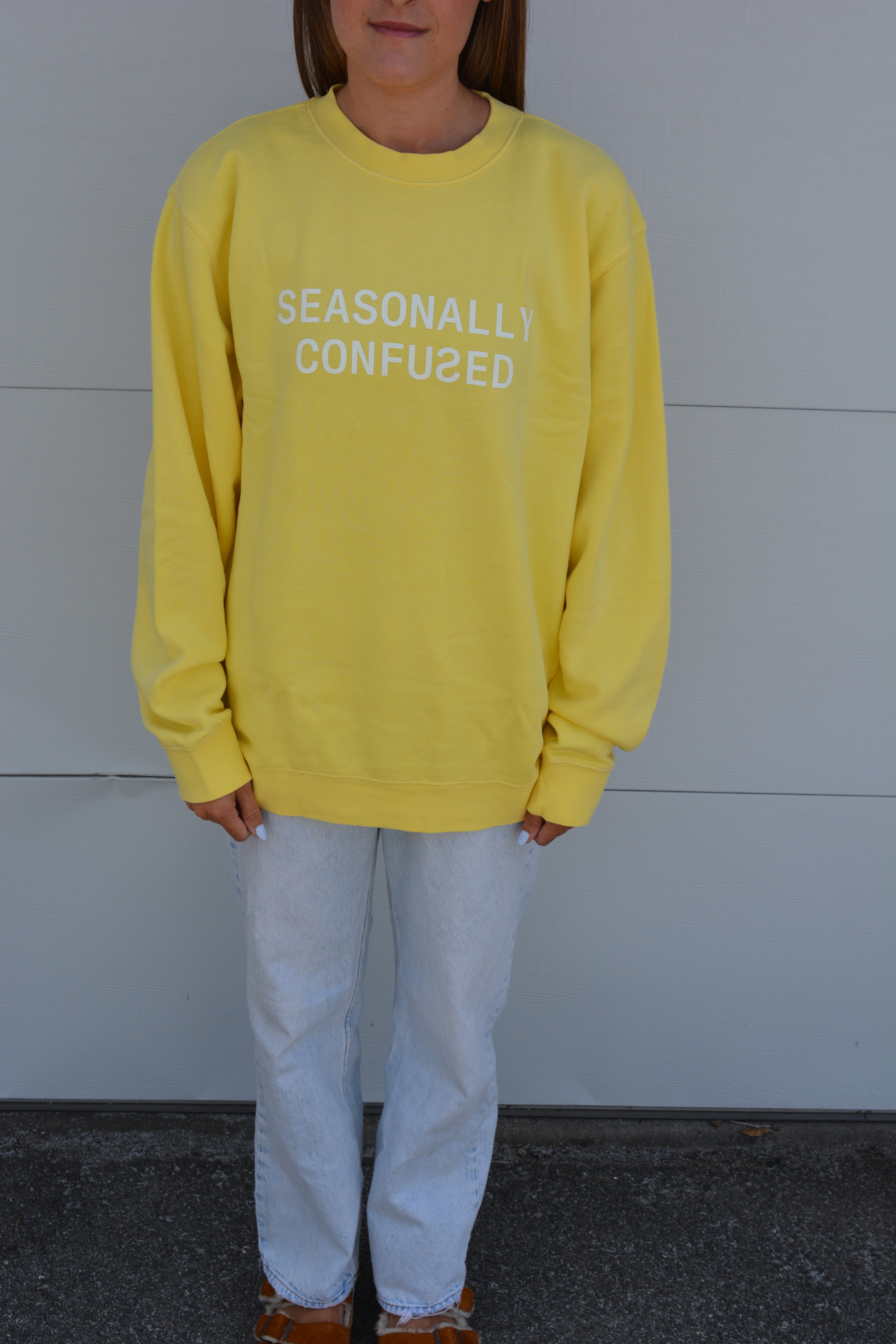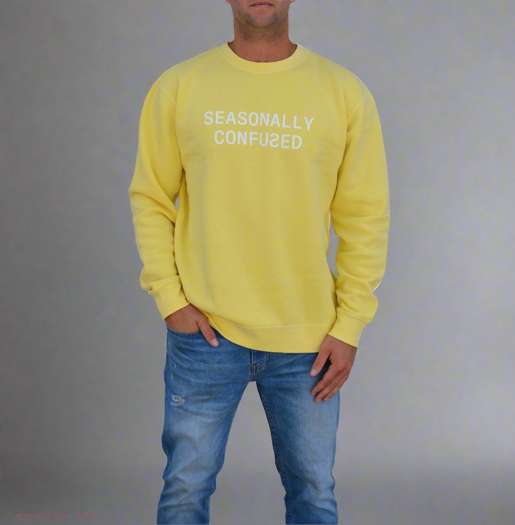 So, if you're ready to embrace your inner weather rebel and turn heads wherever you go, grab yourself a "Seasonally Confused" Crew Neck. Grab it in Summer Sky Blue or Happy Days Yellow.